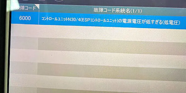 故障診断機にて診断するまでは、各メーカー夏定番のABSセンサーの故障だと思っていました。しかし、診断結果により、バッテリーの電圧低下が原因だと分かりましたので、27,000円(税込)でバッテリー交換をいたします。