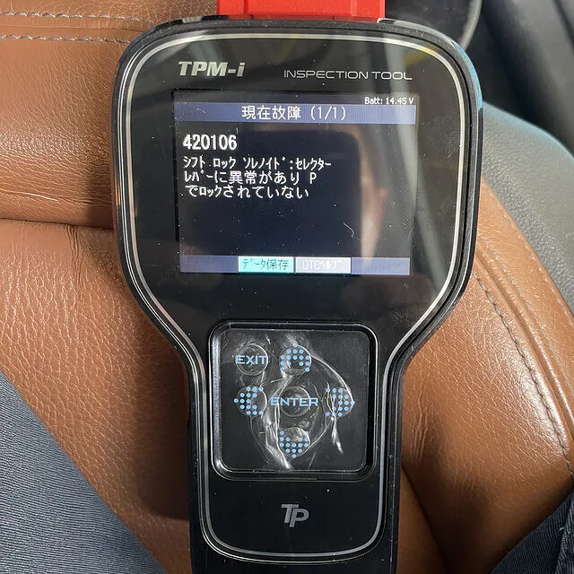 お預かり後に診断機で故障コードを確認すると、表示された内容は「シフトロックソレノイド/セレクターレバーに異常あり、Pにロックされていない」というもの。