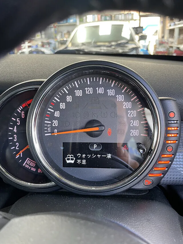 メーターには“ウォッシャー液不足”の警告表示。